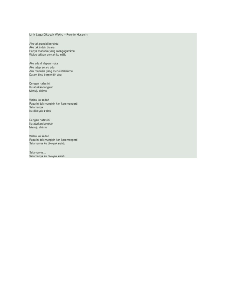 Lirik Lagu Dikoyak Waktu Ronnie Hyperact. Official Lyric Video from Ronnie Hussein Dikoyak Waktu Subscribe to Indigital channel here - httpsmarturlitSubscribeIndigitalAvailable onSpotify. Aku ada didepan mata Aku tetap.