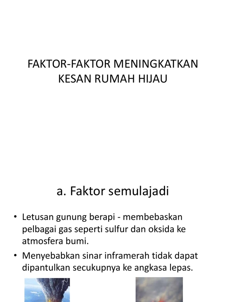 Kesan rumah hijau terjadi apabila berlakunya peningkatan gas rumah hijau seperti karbon dioksida karbon monoksida CFC Nitrogen oksida dan lain-lain. Kesan rumah hijau MAKSUD KESAN RUMAH HIJAU Kesan rumah hijau adalah fenomena penigkatan suhu atmosfera bumiIni disebabkan oleh haba yang diserap dan terperangkap di dalam atmosfera bumi oleh gas tertentugas rumah hijauseperti klorofluorokarbon karbon dioksidametana PUNCA. Cahaya matahari gas dan partikel di atmosfera.